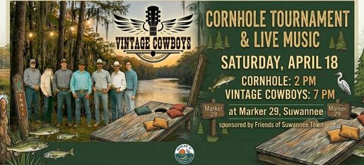 Friends of Suwannee Town invites you to a fun, friendly cornhole tournament right on the water at Marker 29 followed by live music at 7 PM by The Vintage Cowboys.